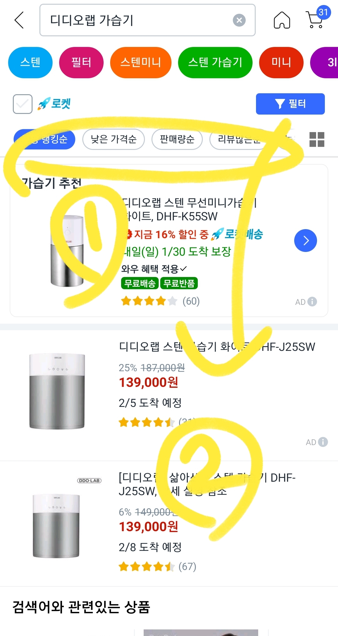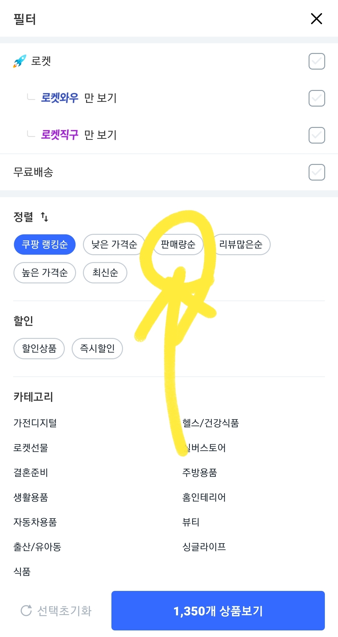 1번 버튼에는 쿠팡랭킹순, 낮은가격순, 판매량순, 리뷰많은 순, 높은가격순, 최신순 으로 정할수 있습니다.
