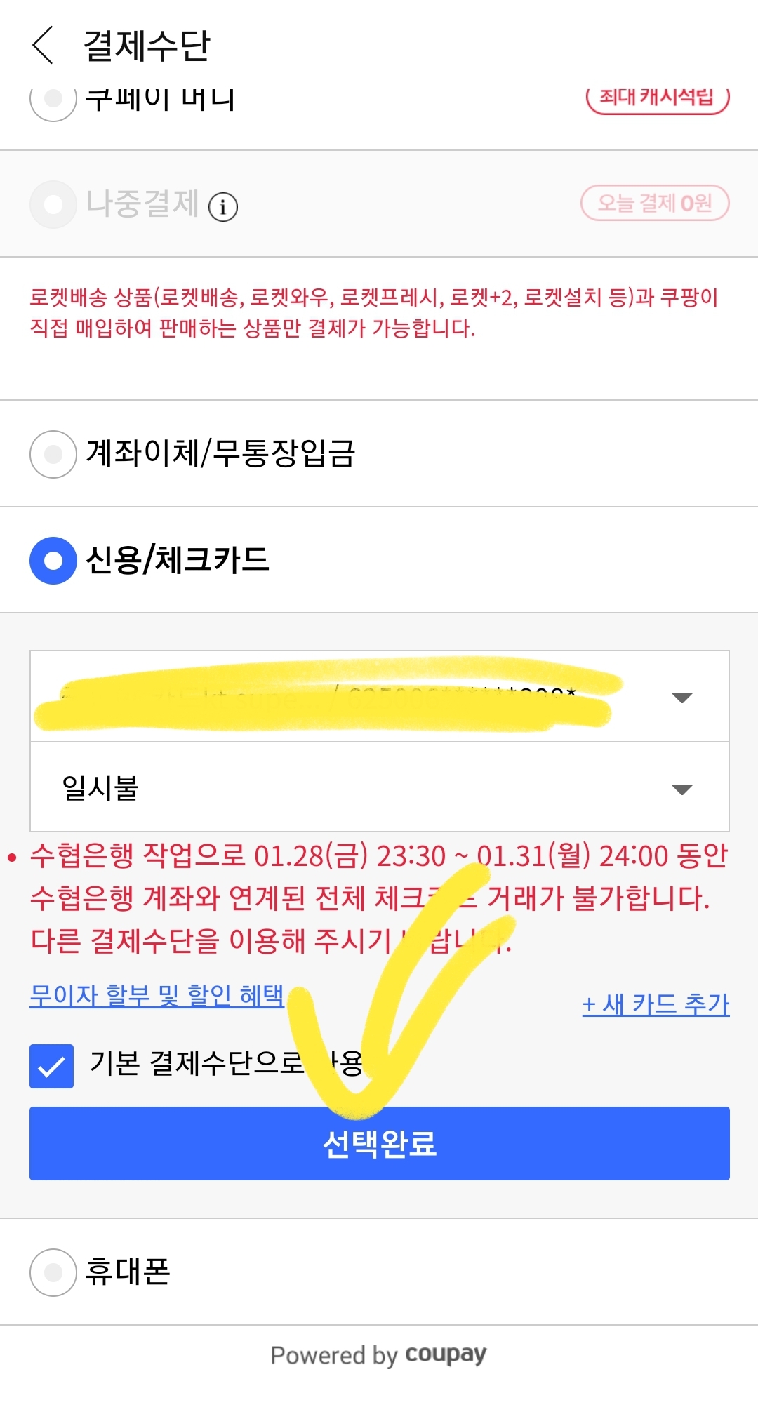 6.여섯번째로, 카드까지 결정해서 진행하면 아래와 같이 [선택완료]를 통해서 결제 진행을 할수 있습니다.