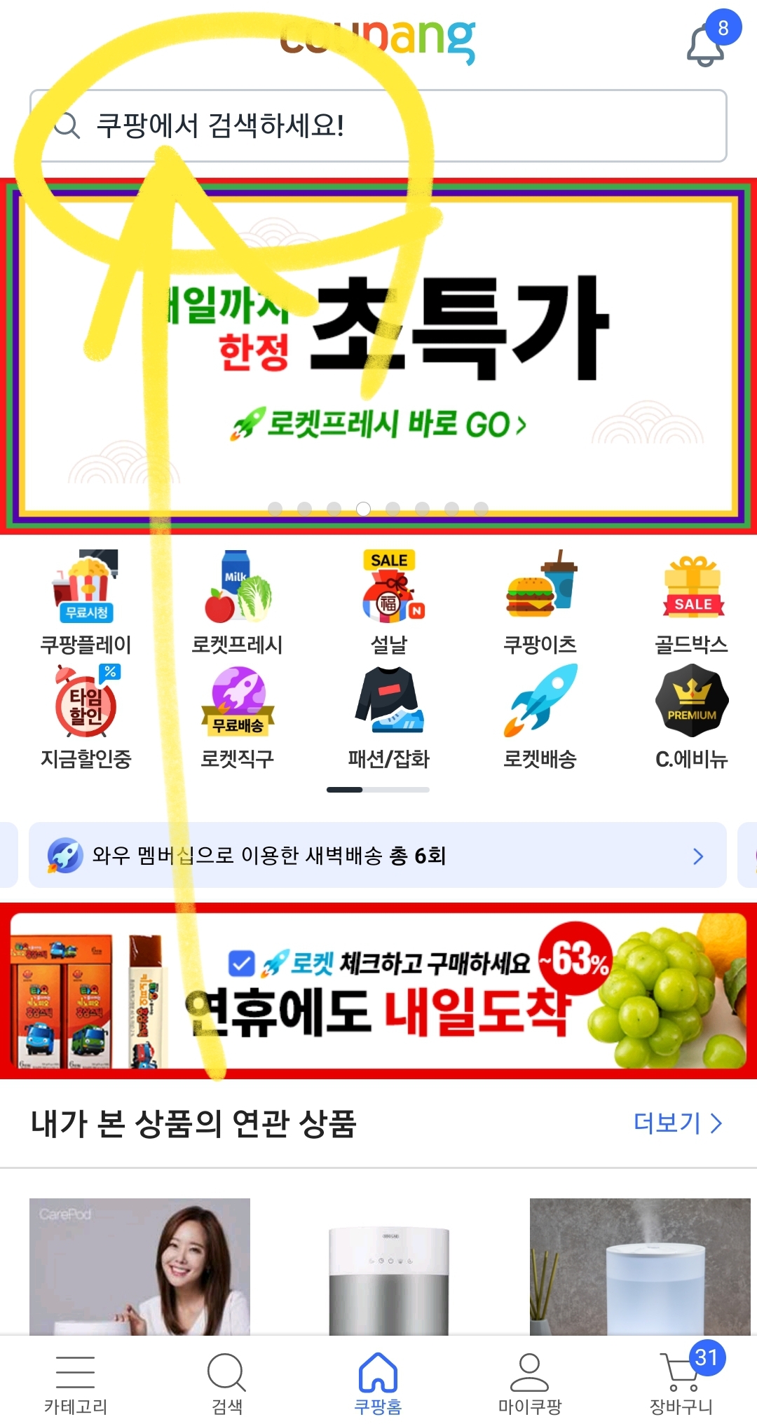 1. 첫번째로, 쿠팡앱을 설치해주세요. [쿠팡앱] 첫 화면 상단에 '쿠팡에서 검색하세요!' 창에