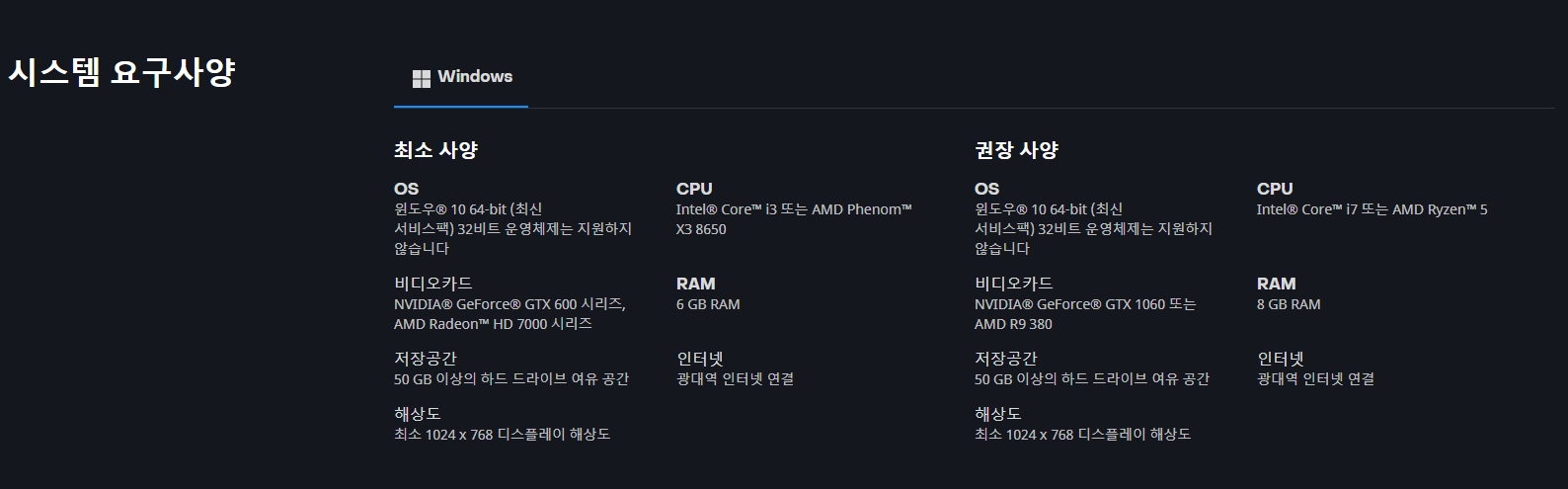 '오버워치2'의 사양은 아래와 같습니다.
