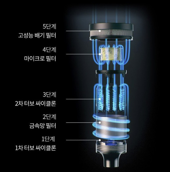 총 5단계 필터여서 1단계 터보 싸이클론 -> 2단계 금속망 필터 -> 3단계 2차 터보 싸이클론 -> 4단계 마이크로 필터 -> 5단계 고성능배기필터로 볼수 있겠네요!