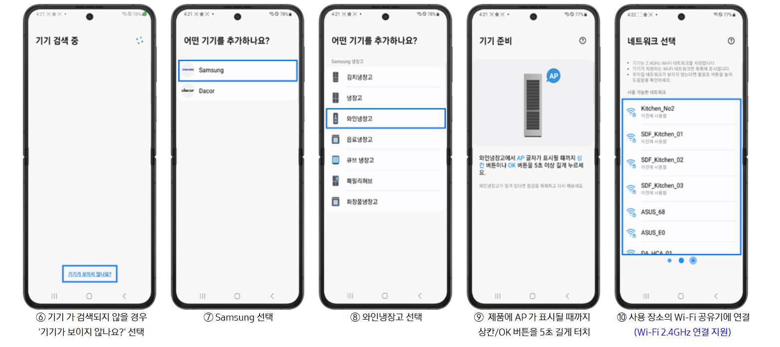 - 기기 검색: 설치할 기기가 검색되지 않으면 '기기가 보이지 않나요?'를 선택하고, 'Samsung'을 선택한 후 '와인냉장고'를 선택합니다.