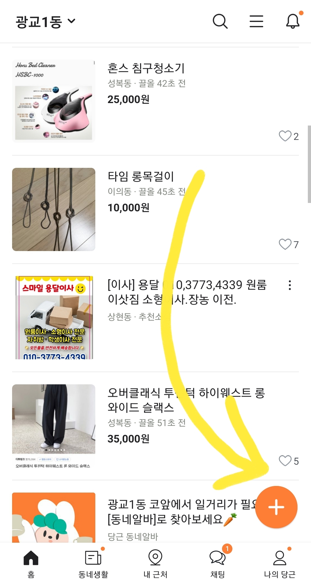 1. 첫번째로, 앱내에서 오른쪽 하단의 [+] 모양의 항목으로 가주시길 바랍니다. -> 두번째로 중고거래 항목으로 가주시길 바랍니다.