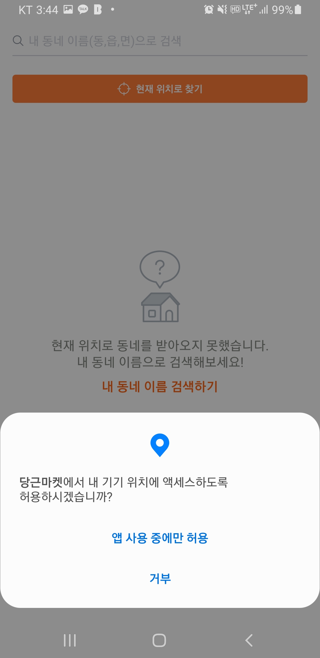 위치를 엑세스 즉 [앱 사용중에만 허용] 해야지 당근마켓을 사용하셔야 됩니다.