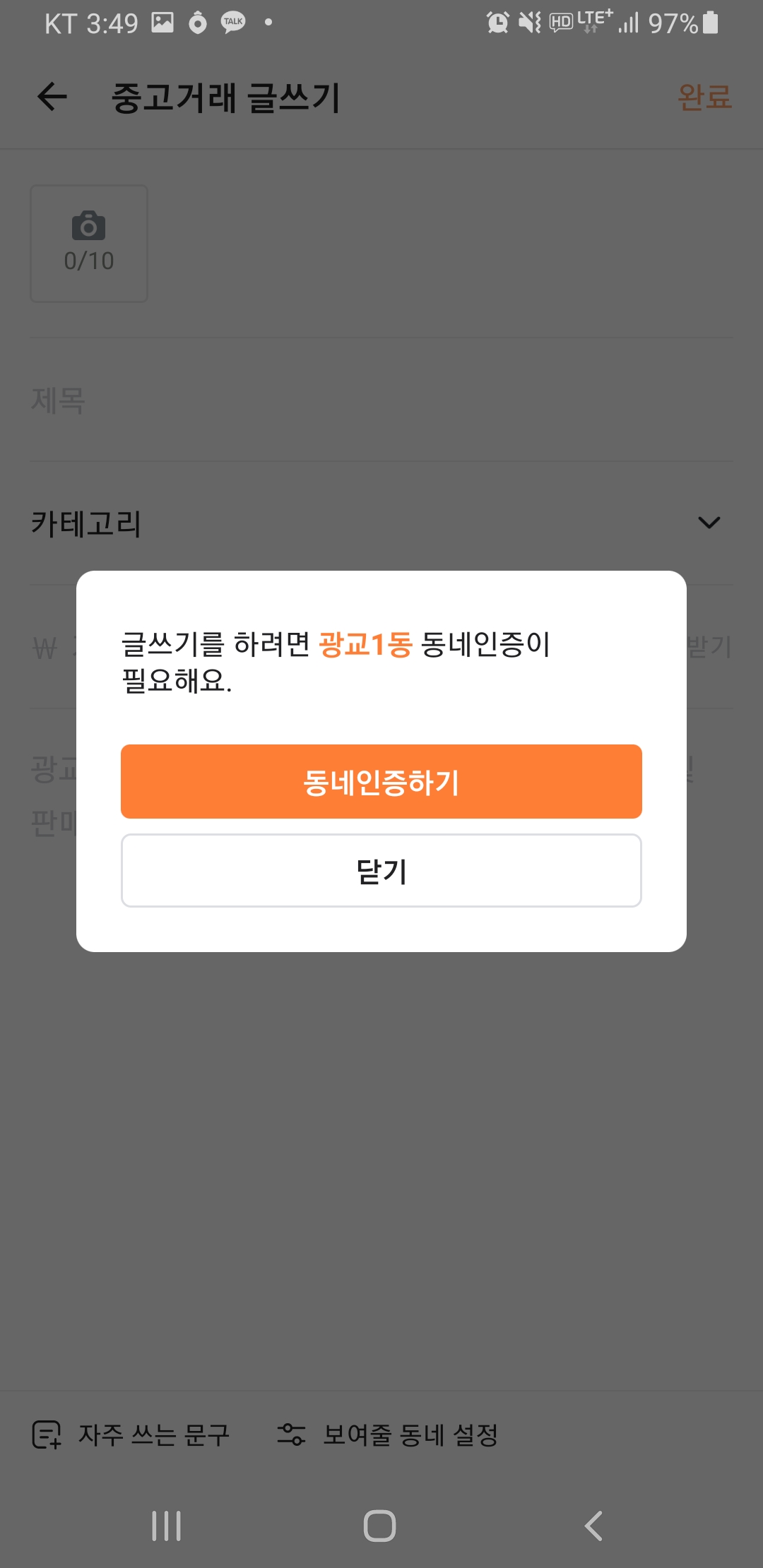 2. 두번쨰로 중고거래 글쓰기 화면이 나오면 동네인증하기 진행해주세요. 동네인증하기 는 위치켜놓으면 자동으로 인증됩니다. 내가 설정한 주소와 현위치가 동일한지 체크하는 작업으로 보시면 됩니다.