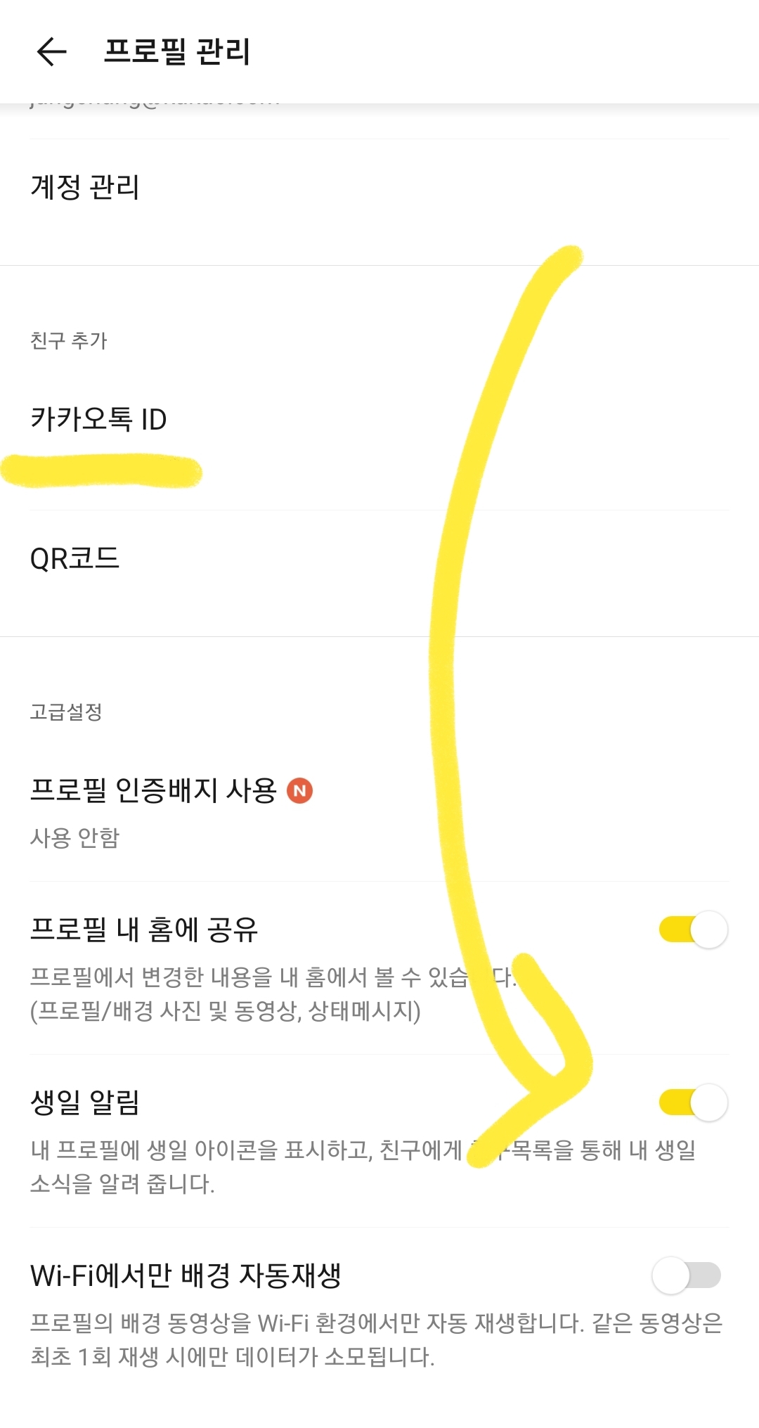 거기서 노란색 동그라미 토글 버튼을 꺼주시면 내 생일 알림이 친구에게 나타나지 않습니다.